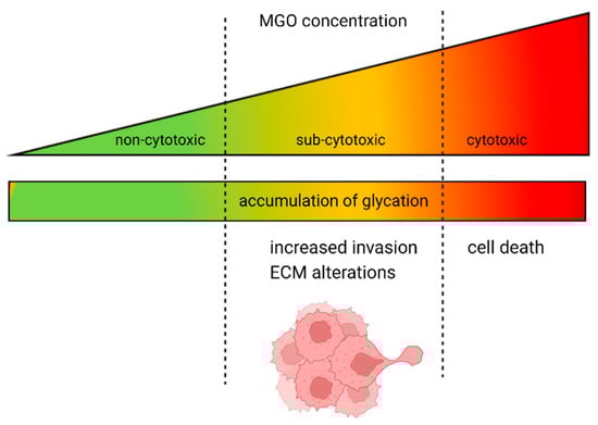 Dual role of MGO in GBM and glioma cells. The increase in glycation is proportional to the rising concentration of MGO. At high doses, MGO has a cytotoxic effect on GBM and glioma cells; however, when present at lower, physiological concentrations, it causes alterations in the ECM and increased invasion.