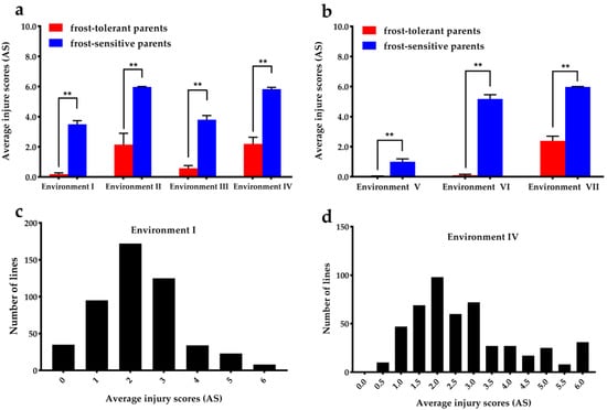 The comparison analysis and frequency distribution of frost tolerance of parents and progenies in various environments. The crossing parent’s frost performance, eight frost-tolerant interspecific hybrids and eight frost-sensitive cultivated potatoes, were evaluated in four environments (Environment I, II, III, IV) at Wuhan (a) and three environments (Environment V, VI, VII) at Luoyang (b), respectively. Frequency distribution of the average injury scores (AS) for frost tolerance of the 23 cross combinations in Environments I (c) and IV (d). Values are the mean of at least three biological replicates. Bars indicate SD. Asterisks indicate significant differences using Student’s t-test (** p < 0.01).