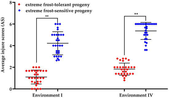 Comparison with frost tolerance of extreme pools in Environments I and IV. Asterisks indicate significant differences using Student’s t-test (** p < 0.01).