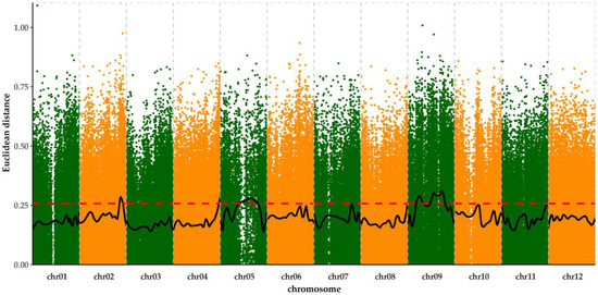Mapping of genetic loci for frost tolerance. The X-axis represents the position of the SNPs on 12 chromosomes and the Y-axis represents the association value of the SNPs calculated by ED (Euclidean distance). The ED distribution was visualized by a 1 Mb sliding window method with a step size of 100 kb at about 90% confidence along all the 1–12 chromosomes. The horizontal red dotted line is the default threshold, which is three standard deviations above the genome-wide median, with a value of 0.277 in this figure.