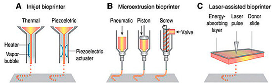 Schematic of present bioprinting techniques: (A) Inkjet bioprinters use a source of heat to create vapor in the print head. This vapor generates pressure within the nozzle that forces bioink from the tip. Piezoelectric print heads use pulses generated through ultrasound or piezoelectric pressure. (B) Extrusion printers use a mechanical dispensing system, requiring a screw, piston, or pneumatic pressure. (C) Laser bioprinting uses a laser pulse that strikes a point on a laser-absorbent surface; this surface generates a miniature burst of vapor that drives the biomaterial onto the substrate [6].