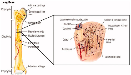 Beyond their own bone cells, bones also contain several other organic and inorganic compounds, including mineralized osseous tissue, bone marrow, endosteum and periosteum, nerves, blood vessels, and cartilage [14]. For example, all long bones, including those in the shoulder, arms, and legs, have three primary regions: the epiphysis, the diaphysis, the epiphysis, and the epiphyseal plates [14], as shown in Figure 2. The former makes up the long portion of these bones and consists primarily of cortical (compact) bone that makes up about 80% of its total mass [14]. Contrastingly, the epiphysis contains primarily cancellous (spongy) bone and red bone marrow. The epiphyseal (growth) plate is active only during the bone growth process and promotes bone lengthening. Once the bone has finished growing, the epiphyseal plate ossifies [14].