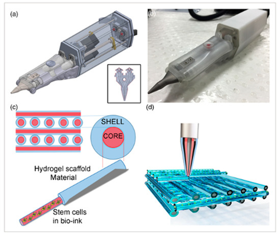 The Biopen is used for cartilage regeneration. (a) Schematic of the two chambers inside the Biopen and coaxial printing mechanism. (b) The Biopen photographed. (c) Coaxial printing allows for division between the shell and core. (d) Three-dimensional scaffolds can be printed in specific patterns using this handheld device. The schematic is taken from Di Bella, C. et al. [49].
