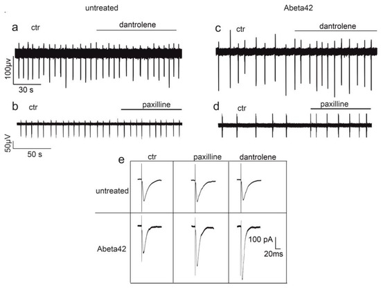 Abeta42 inhibits hippocampal network excitability by targeting RyRs. (a)Spontaneous electrical activity of primary cultured hippocampal network, as recorded by MEA (one representative trace), showing that, in the absence of Abeta42 (ctr), RyR inhibition through dantrolene does not affect the spontaneous frequency of extracellularly recorded action potentials. (b) Similar results have been obtained by blocking BK (big conductance potassium) channels using paxilline, suggesting that, under control conditions, neither the RyR nor BK channels are involved in the modulation of hippocampal network excitability. (c,d) When neurons are incubated with Abeta42 oligomers, it is observed that decreased firing activity is partly rescued by dantrolene or paxilline administration. (e) eEPSC amplitude is increased following paxilline or dantrolene administration in hippocampal neurons previously treated with Abeta42, while no effects were observed in the absence of Abeta42 (untreated neurons) adapted from [7].