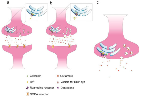 - Narita, K.; Akita, T.; Hachisuka, J.; Huang, S.; Ochi, K.; Kuba, K. Functional coupling of Ca2+ channels to ryanodine receptors at presynaptic terminals. Amplification of exocytosis and plasticity. J. Gen. Physiol. 2000, 115, 519–532. [Google Scholar] [CrossRef]
