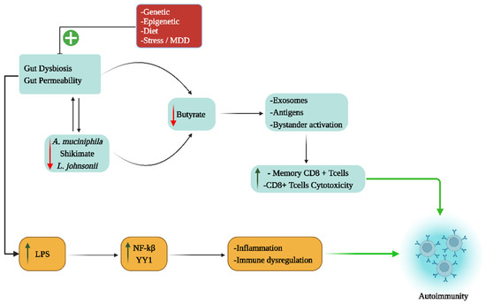 The figure shows how systemic processes such as the gut microbiome/permeability can influence the immune response. Genetic, epigenetic, dietary and stress/MDD can increase gut permeability-derived LPS, leading to an increase in the pro-inflammatory transcription factors, NF-kB and YY1, to contribute to inflammation and patterned immune response dysregulation that influence processes driving autoimmune responses. Gut dysbiosis can be induced by genetic, epigenetic, dietary and stress/MDD processes, including via a decrease in the operation of the Shikimate pathway and associated suppression of the gut bacteria, Akkermansia muciniphila and Lactobacillus johnsonii, leading to a decrease in the HDACi and mitochondrial-optimizing effects of the short-chain fatty acid, butyrate. Butyrate suppresses the exosomes, gut antigen priming and bystander activation of CD8+ T cells, thereby suppressing the induction of ‘autoimmune’ processes. Abbreviations: HDACi: histone deacetylase inhibitor; LPS: lipopolysaccharide; MDD: major depressive disorder; NF-kB: nuclear factor kappa-light-chain-enhancer of activated B-cells; YY1: yin yang 1.