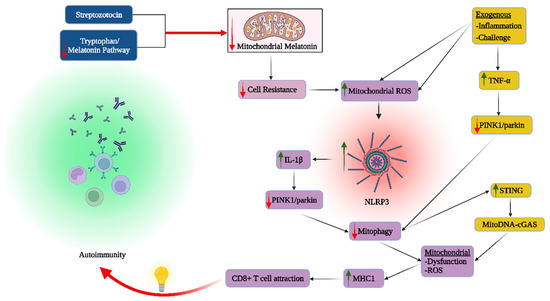 The figure shows how a decrease in melatonin and the melatonergic pathway by streptozotocin or a suppressed tryptophan-melatonin pathway increases cell susceptibility to challenge, including intercellular within a given microenvironment, resulting in increased mitochondrial ROS, which induces the NLRP3 inflammasome to increase IL-1β, which, similar to TNFα, suppresses PINK1/parkin to decrease mitophagy, thereby leading to mitochondrial energy, ROS and ROS-driven microRNA dysregulation, in turn driving raised MHC-1 levels and CD8+ T cell attraction. TNFα inhibition of PINK1/parkin can also increase STING and mitochondrial DNA binding with cGAS. Both processes (purple and gold shading) contribute to ‘autoimmunity’. Abbreviations: cGAS: cyclic guanosine monophosphate-AMP synthase; IL-1: interleukin-1; MHC: major histocompatibility complex; NLRP3: NLR family pyrin domain containing 3; PINK1: PTEN-induced kinase 1; STING: (cGAS)-stimulator of interferon genes; ROS: reactive oxygen species; TNF: tumor necrosis factor.
