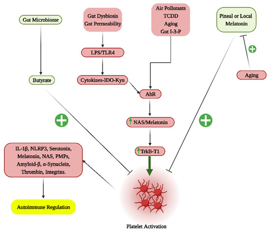 The figure shows how the variety of fluxes following platelet activation can regulate metabolic and immune processes underpinning ‘autoimmune’ disorders, as well as how platelet activation may be regulated, and integrated, with systemic processes, including the gut microbiome/permeability and circadian, pineal melatonin (green shade inhibitory and red shade stimulatory regarding platelet activation). Butyrate production by a healthy gut microbiome inhibits platelet activation, as does pineal or local melatonin. The dramatic decrease in pineal melatonin over aging will suppress the capacity of the circadian rhythm to dampen platelet activation. Gut dysbiosis/permeability increases circulating LPS that activates TLR4 to induce pro-inflammatory cytokines, which increase IDO. IDO conversion of tryptophan to kynurenine activates the AhR, which induces CYP1A2 and CYP1B1 to backward convert platelet melatonin to NAS. NAS, intracrine and/or autocrine can activate platelets via truncated receptor, TrkB-T1. Other AhR ligands, including air pollutants, TCDD and gut-derived I-3-P and its derivates also activate the AhR. Aging increases the AhR, which is expressed in the cytosol and on the mitochondrial membrane. Abbreviations: AhR: aryl hydrocarbon receptor; I-3-P: indole-3-propionate; IDO: indoleamine,2,3-dioxygenease; kyn: kynurenine; LPS: lipopolysaccharide; NAS: N-acetylserotonin; PMPs: platelet microparticles; TCDD: 2,3,7,8-tetrachlorodibenzo-p-dioxin; TLR: toll-like receptor; trkB-T1: tyrosine receptor kinase B-truncated 1.
