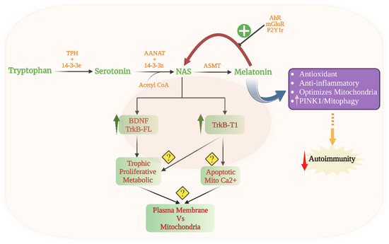 The figure shows the tryptophan-melatonin pathway (green shade). Tryptophan is metabolized by tryptophan hydroxylase (TPH). TPH requires stabilization by 14-3-3e to convert tryptophan to serotonin, which is the necessary precursor for the initiation of the melatonergic pathway. Serotonin can also be provided by neuronal inputs and other cellular sources, especially platelets. In the presence of acetyl-CoA, serotonin is converted by 14-3-3-stabilized AANAT to N-acetylserotonin (NAS), which is then converted by AANAT to melatonin. Aryl hydrocarbon receptor (AhR) activation ‘backward’ converts melatonin to NAS via O-demethylation as well as increasing the NAS/melatonin ratio, as can purinergic P2Y1r activation and glutamate activation of mGluR5. NAS can increase BDNF levels as well as activating TrkB receptors, both full-length (TrkB-FL) and truncated (TrkB-T1). TrkB-FL generally has trophic, proliferative and metabolic-enhancing effects, whilst TrkB-T1 has differential effects in different cells. The presence of TrkB on the mitochondrial membrane and plasma membrane may underlie TrkB-T1 differential actions in different cells. Melatonin has many protective effects as well as suppressing oxidative stress and MHC-1-linked autoimmunity. Abbreviations: AANAT: aralkylamine N-acetyltransferase; AhR: aryl hydrocarbon receptor; ASMT: N-acetylserotonin O-methyltransferase; BDNF: brain-derived neurotrophic factor; CYP: cytochrome P450; mGluR: metabotropic glutamate receptor; MHC-I: major histocompatibility complex-class I; Mito: mitochondria; NAS: N-acetylserotonin; P2Y1r: purinergic P2Y1 receptor; PINK1: PTEN-induced kinase 1; TrkB-FL: tyrosine receptor kinase B-full length; TrkB-T1: tyrosine receptor kinase B-truncated.