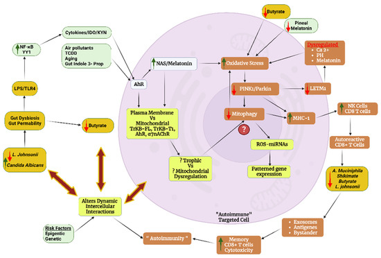 The figure shows how gut dysbiosis, gut permeability, pro-inflammatory cytokines, Candida albicans fungal infection and decreased pineal melatonin act to suppress melatonin production, upregulate the NAS/melatonin ratio and target the AhR in autoimmune targeted cells. The AhR ligands, including gut indole-3-propionate and derivatives, and NAS have differential effects at the mitochondrial AhR, TrkB-FL and TrkB-T1, as will acetylcholine at the mitochondrial a7nAChR (not shown for clarity). Gut dysbiosis/permeability and Candida albicans increase NF-kB and YY1 pro-inflammatory transcription factors leading to increased IDO and kynurenine activation of the AhR, along with many other AhR ligands. Gut dysregulation and suppressed pineal melatonin will also alter the homeostatic interactions within a given cell’s microenvironment, leading to intercellular changes that further challenge an ‘autoimmune’ susceptible cell. The suppression of the mitochondrial melatonergic pathway enhances oxidative stress, thereby decreasing PINK1 and its interactions with parkin and LETM1 on the mitochondrial membrane. Decreased PINK1 suppresses mitophagy, coupled with increased MHC-1 that drives ‘autoimmune’ processes via NK cell and CD8+ T cell attraction. Decreased PINK1 attenuates LETM1 phosphorylation, leading to Ca2+ and pH dysregulation, likely accompanied by alterations in how LETM1 interacts with 14-3-3 and/or AANAT in the regulation of the mitochondrial melatonergic pathway. Heightened oxidative stress, decreased mitophagy and suppressed melatonin increase ROS-driven miRNAs to change the patterned gene expression, relevant to both ‘autoimmune’ processes as well as dynamic intercellular interactions. Increased MHC-1 chemoattracts CD8+ T cells, with autoreactive CD8+ T cells being regulated by the gut via exosomes, antigens and/or bystander activation. The increased cytotoxicity of memory CD8+ T cells drives ‘autoimmune’ processes. Reduced Akkermansia muciniphila and limited shikimate pathway activation not only suppress tryptophan availability but also contribute to gut dysbiosis/permeability, thereby influencing the gut’s regulation of memory CD8+ T cells. Abbreviations: a7nAChR: alpha 7 nicotinic acetylcholine receptor; AhR: aryl hydrocarbon receptor; BDNF: brain-derived neurotrophic factor; IDO: indoleamine 2,3-dioxygenase; Indole-3-prop: indole-3-propionate; LETM1: leucine zipper-EF hand-containing transmembrane protein 1; LPS: lipopolysaccharide; MHC-1: major histocompatibility complex-class 1; NAS: N-acetylserotonin; NF-kB: nuclear factor kappa-light-chain-enhancer of activated B-cells; NK: natural killer; TCDD: 2,3,7,8-tetrachlorodibenzo-p-dioxin; TrkB-FL: tyrosine kinase receptor B-full length; TrkB-T1: tyrosine kinase receptor B-truncated; YY1: yin yang 1.