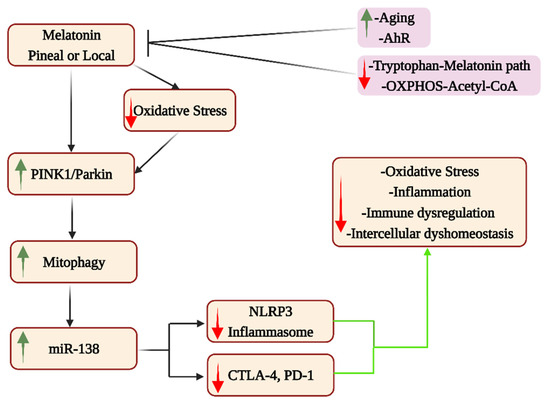 The interface of the mitochondrial melatonergic pathway with miRNAs is a cutting-edge area of research relevant to ‘autoimmune’-linked processes. For example, miR-138 suppresses PD-1, and another ‘immune-checkpoint’ inhibitor, cytotoxic T-lymphocyte-associated molecule 4 (CTLA-4) [149]. The role of the mitochondrial melatonergic pathway in miR-138 regulation is indirectly indicated by data showing mitophagy upregulation to enhance miR-138 via promotor demethylation, with miR-138 suppressing the NLRP3 inflammasome, as well as PD-1 and CTLA-4 [150]. The capacity of melatonin, both pineal and locally, to upregulate mitophagy as well as to suppress oxidative stress and the NLRP3 inflammasome in Alzheimer’s disease and Alzheimer’s disease models [151] would indicate that melatonin upregulates miR-138, thereby contributing to NLRP3, CTLA-4 and PD-1 suppression, with relevance to aging-associated changes in immune responsivity (see Figure 7). As with other cell types, the regulation of the mitochondrial melatonergic pathway in immune and glia cells will be important to determine over the course of aging, especially whether the 10-fold decrease in pineal melatonin production and release at 80 years, compared to 18 years, is replicated in other cell types. Whether aging-associated immune changes limit the likelihood of developing a classical ‘autoimmune’ disorder during aging, as is the case in T1DM [17], but contribute to the maintenance of dyshomeostasis in local microenvironment interactions, requires investigation across different medical conditions. This could suggest that changes over aging limit the capacity to develop a full-blown classical ‘autoimmune’ disorder, but with the dysregulated homeostasis being the basis of aging-linked conditions, such as neurodegenerative disorders. Overall, alterations in the mitochondrial melatonergic pathway and mitophagy during aging will impact intercellular homeostatic processes in the microenvironment of specific medical conditions, with aging-associated increases in AhR and ligands altering the interactions of cytolytic cells within these microenvironments.