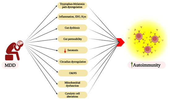 MDD modulates the initiation and/or episodic symptom exacerbations of most ‘autoimmune’/‘immune-mediated’ disorders, including multiple sclerosis [184], rheumatoid arthritis [183], Alzheimer’s disease [185], Parkinson’s disease [186] and SLE [187], indicating the role that MDD pathophysiology has in their course. MDD pathophysiology includes gut dysbiosis/permeability, pro-inflammatory cytokines, IDO induction and the conversion of tryptophan to kynurenine, leading to enhanced AhR activation, thereby dysregulating the tryptophan-melatonin pathway [188], and allowing the MDD pathophysiology to be intimately linked to the pathophysiological processes underpinning ‘autoimmune’ disorders. The long-standing association of decreased serotonin in MDD is closely intertwined with lower serotonin availability as a precursor for the melatonergic pathway, and therefore intimately linked to alterations in mitochondrial function and cellular plasticity, especially under challenge [188]. Notably, MDD pathophysiology seems highly heterogenous [189], with astrocytes being an important hub in coordinating changes in neuronal activity and interarea patterned neuronal activity in the brain [4,179]. However, MDD samples in any given study show significant heterogeneity in physiological indices, the investigation of which should better define the classification and treatment not only of MDD [98,190], but of the associations of MDD with autoimmune disorders.