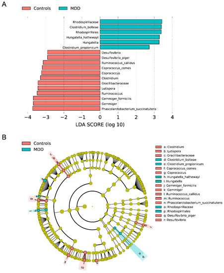 3.4. Differential Abundance of Gut Bacteria between the Control and MDD Groups