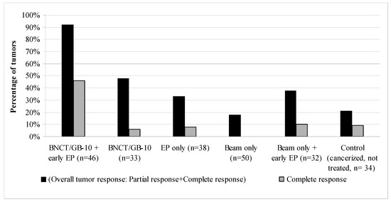 We observed that GB-10/BNCT + early EP increased the percentage of CR in small tumors. The electric pulses can reach all tumor cell populations more easily in small tumors, while in medium and large tumors, tumor cells at the center of the tumor could be receiving less electricity [53,54]. Previous studies have also shown that the antitumor efficacy of EP used for the delivery of chemotherapeutic agents (electrochemotherapy—ECT) was inversely proportional to the tumor size. These authors compared ECT and surgery in dogs with mast cell tumors (MCT). They observed that ECT induced a 70% complete response rate, while surgery induced a 50% complete response rate. They proposed ECT as an alternative treatment to surgery, especially in cases of smaller MCTs and those that are unresectable due to their location [55]. For larger tumors, they proposed a combination of surgical removal and intraoperative ECT [35,56].