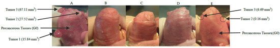 Macroscopic follow up of the hamster cheek pouch bearing tumors treated with GB-10/BNCT + early EP at T0 (A), 7 days (B), 14 days (C), 21 days (D), and 28 days (E) after treatment. The hamster cheek pouch exhibited slight mucositis that completely resolved by the end of the follow-up. (E) Tumor 1 exhibited a complete response (CR); Tumors 2 and 3 exhibited volume reductions of almost 90% after 28 days after GB-10/BNCT + early EP. G0 = Grade 0 mucositis.