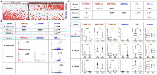 The correlations with CRC markers also identified the same three bifidobacterial species (B. adolescentis, B. longum, and B. bifidum) as being significantly associated with one or more of the “pathogenic” CRC-related bacterial gene markers (Fn, Ch, m3, and 8Up) and of the “beneficial” markers (Bc and 12Down) (Figure 2A). B. adolescentis and B. longum were inversely correlated with Fn (Pearson’s r of −0.1 and −0.096, respectively, both p < 0.05). B. longum was positively correlated with Bc (r = 0.106, p = 0.01). B. adolescentis, B. longum, and B. bifidum were positively correlated with 12Down (Pearson’s r of 0.135, 0.134 and 0.126, respectively, all p ≤ 0.002) (Figure 2B). We further checked the fold changes of the CRC gene markers with the presence of the bifidobacteria compared to the samples without the corresponding bifidobacteria. The presence of each of the three bifidobacterial species was significantly associated with a decrease in at least one of the “pathogenic” markers (Fn, Ch, m3, and 8Up) and an increase in at least one of the “beneficial” markers (Bc and 12Down) (Figure 2C). These data support the potential effect of B. adolescentis, B. longum, and B. bifidum in CRC prevention based on the inverse correlation with CRC-associated microbial risk markers.