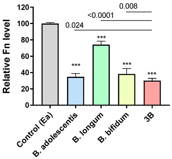 In vitro co-culturing with bifidobacteria significantly inhibited the growth of F. nucleatum (Fn) compared to the control treatment by E. aldenensis (Ea). 3B, combination of B. adolescentis, B. longum, and B. bifidum. Dosages of all treatments: Fn = 1:1. *** p < 0.0001 vs. control.