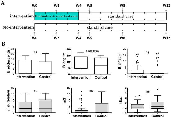 (A) Flow diagram of the pilot clinical study. The recruited patients in the intervention group took probiotic capsules daily from baseline (week 0, W0) to W4. Stools were collected from both groups of patients at W0, W2, W4, W5, W8, and W12. All patients in both intervention and no-intervention groups received the same treatment protocol for COVID-19 endorsed by the local health authority. (B) Baseline levels of B. adolescentis, B. longum, B. bifidum, and the CRC-related microbial markers showed no significant difference between the intervention and no-intervention groups. ns, not significant.