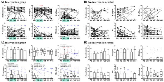 Intervention with the probiotic formula containing B. adolescentis, B. longum, and B. bifidum reduced microbial risk for CRC. (A) Changes in B. adolescentis, B. longum, and B. bifidum and the CRC-related microbial markers were detected in the intervention group by paired t-test vs. W0 (A1) and Mann–Whitney U test vs. W0 (A2). (B) No significant changes in B. adolescentis, B. longum, B. bifidum, and the CRC-related microbial markers were found in the no-intervention group by paired t-test vs. W0 (B1) or Mann–Whitney U test vs. W0 (B2). * p < 0.05, ** p < 0.001, *** p < 0.0001; red denotes increase and blue denotes decrease. Changes are not significant if not indicated.