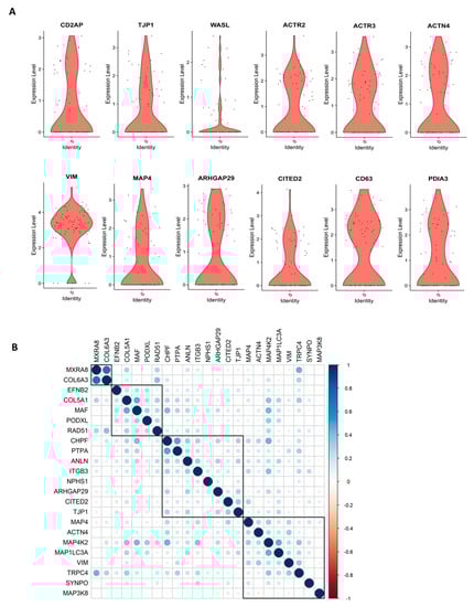 scRNASeq reveals individual differences in morphology marker of cultured ciPodocytes. (A): Violin plots of expression levels of genes involved in cell morphology and actin cytoskeleton. ACTN: Actinin 4, ACTR3: Actin-related protein 2, ACTR2: Actin-related protein 2, ARHGAP29: Rho GTPase-activating protein 29, CD2AP: CD2 associated protein, ciPodocytes: Conditional immortalized podocytes, CITED2: Cbp/p300-interacting transactivator 2, MAP4: Microtubule-associated protein 4, PDIA3: Protein disulfide-isomerase A3 endoplasmatic reticulum, scRNASeq: Single-cell RNA sequencing, TJP1: Tight junction protein-1, VIM: Vimentin, WASL: Neural Wiskott-Aldrich syndrome protein. (B): Spearman’s correlation analysis of gene expression of podocytes and morphology marker genes. Heat map visualization shows the Spearman correlation analysis for podocytes and morphology markers clustered with the ward.D2 method. A strong correlation is blue, and a low correlation is red. ANLN: Anillin, ARHGAP29: Rho GTPase-activating protein 29, CHPF: Chondroitin polymerizing factor, PTPA: Protein phosphatase 2 phosphatase activator, CITED2: Cbp/P300 interacting transactivator with Glu/Asp rich carboxy-terminal domain 2, COL5A1: Collagen 5A1, COL6A3: Collagen 6A3, EFNB2: Ephrin B2, ITGB3: Integrin beta 3, MAF: Transcription factor Maf, MAP3K8: Mitogen-activated protein kinase kinase kinase 8, MAP4K2: Mitogen-activated protein kinase kinase kinase kinase 2, MAP1LC3A: Microtubule associated protein 1 light chain 3 alpha, MXRA8: Matrix remodeling-associated 8, NPHS1: Nephrin, PODXL: Podocalyxin like, SYNPO: Synaptopodin, TJP1: Tight junction protein-1, TRPC4: Transient receptor potential channel 4, VIM: Vimentin.