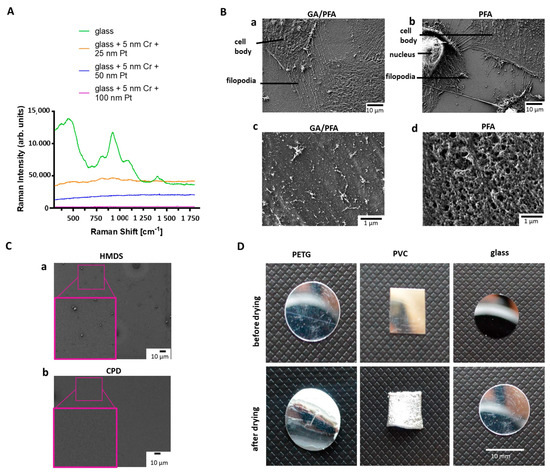 Moreover, we were the first to perform Raman spectroscopy on ciPodocytes [36]. This spectroscopy method is a technique for optical and chemical characterization of the compositional properties of materials. It detects the inelastic scattering of light from molecules, which results in a change in wavelength that corresponds to specific molecular vibrational modes. The platinum coatings of the glass cover slides allowed a better contrast for SEM imaging and, likewise, an improved conductivity of the sample, resulting in decreased background signal. For more stable platinum coating, an interface layer of chromium was used, as, without chromium, the platinum delaminated from the glass substrate in the vacuum of the SEM.
