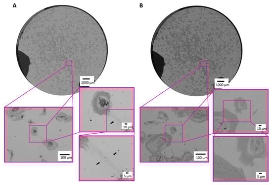 Next, we proved our established correlative microscopic workflow on cultured human ciPodocytes left untreated or stimulated with TGF-β. First, an overview image was generated using the LM. The whole sample was scanned in sufficient resolution to resolve the required structures for identification of the cells of interest and selected as ROIs (Figure 3A,B). Even under light microscopy, it was possible to identify long cell processes of untreated ciPodocytes (black arrow in Figure 3A), even though there were minimal limitations in contrast of the sample, most likely due to the substrate coating with chromium, platinum and laminin.