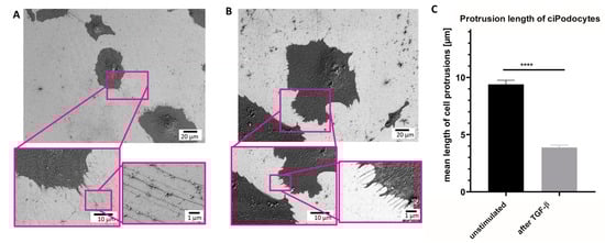 Scanning electron micrograph of ROI of untreated and TGF-ß podocytes cultured human. (A): SEM of ROI of untreated ciPodocytes in different magnifications. Top: scale bar: 20 µm; bottom left: scale bar: 10 µm, bottom right: scale bar: 1 µm. (B): SEM of ROI of TGF-β-treated ciPodocytes in different magnifications. Top: scale bar: 20 µm; bottom left: scale bar: 10 µm, bottom right: scale bar: 1 µm. (C): Quantification of protrusion length in untreated and TGF-β-treated podocytes. **** p < 0.0001. n = 638 protrusions in untreated ciPodocytes; n = 445 protrusions in TGF-β-treated ciPodocytes. ciPodocytes: Conational immortalized podocytes, ROI: Region of interest, SEM: Surface electron microscopy.