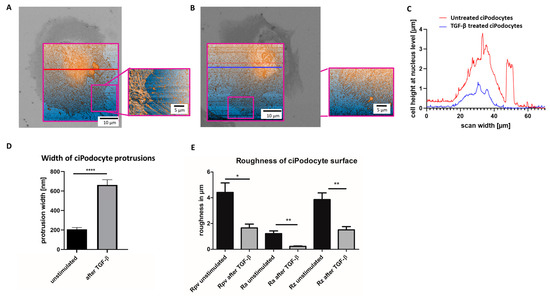 Afterwards, the ROI of the sample was retrieved in AFM by the nanoGPS Oxyo® tag. (Figure 6A–E). Cell surface roughness calculated by 10% mean-height roughness (Rpv), average roughness (Ra) and difference between the highest “peak” and the deepest “valley” in the surface (Rz) was significantly lower in TGF-β-stimulated podocytes, compared to unstimulated podocytes, indicating a flatter cell surface after stimulation (Figure 6E). Untreated podocytes revealed a median height of about 4 µm, and an average protrusion width of about 200 nm, with this method. After TGF-β stimulation, the median podocyte height was decreased to less than 2 µm, and average protrusion width increased to more than 600 nm (Figure 6A–E).