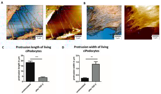 SICM scans of untreated and TGF-β-treated living cultured human podocytes. (A): SICM of ROI of untreated ciPodocytes, scale bar: 5 μm. (B): SICM of ROI of TGF-β-treated ciPodocytes, scale bar: 5 μm. (C): Quantification of protrusion length of untreated and TGF-β-treated living ciPodocytes. *** p < 0.001. (D): Quantification of protrusion width of untreated and TGF-β-treated living ciPodocytes. ** p < 0.01. ciPodocytes: Conditional immortalized podocytes, ROI: Region of interest, SICM: Scanning ion-conductance microscopy.