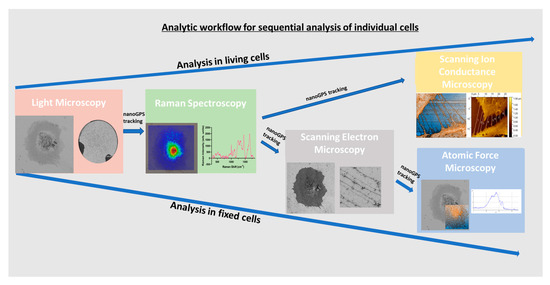 Sequential workflow for analyzing living or fixed cells by different microscopic and spectroscopic techniques within the same cell via nanoGPS tracking.