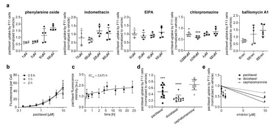 To detect possible passive transport mechanisms, we preincubated F11 cells with inhibitors of phagocytosis (phenylarsine oxide at 1 µM, 5 µM, 10 µM, and 100 µM), caveolae-mediated endocytosis (indomethacin at 75 µM, 150 µM, 225 µM, and 300 µM), micropinocytosis (EIPA at 10 µM, 25 µM, 50 µM, and 100 µM), clathrin-mediated endocytosis (chlorpromazine at 0.0064 µM, 0.016 µM, 4 µM, and 100 µM), and autophagy (bafilomycin A1 at 10 nM, 100 nM, and 500 nM) before exposure to 1 µM of paclitaxel. Paclitaxel uptake was not altered by any inhibitor treatment with either phenylarsine oxide, indomethacin, EIPA, or bafilomycin (Figure 1a). Inhibiting clathrin-mediated endocytosis with chlorpromazine showed significant effects only at 0.0064 µM and 0.016 µM.