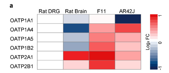 Our previously described findings suggest a drug-transport mechanism for paclitaxel. Hence, we examined the expression of OATPs in rat DRG tissue, rat brain tissue, neuronal cell line F11, and pancreatic cancer cell line AR42J (Figure 2a). Compared with rat DRG tissue, OATP1A1, OATP1A4, OATP1A5, and OATP1B2 are decreasingly expressed, while OATP2A1 and OATP2B1 are increasingly expressed in rat brain. Except for OATP1A1, all OATPs were more highly expressed in F11 or AR42J cells compared with DRG tissue.