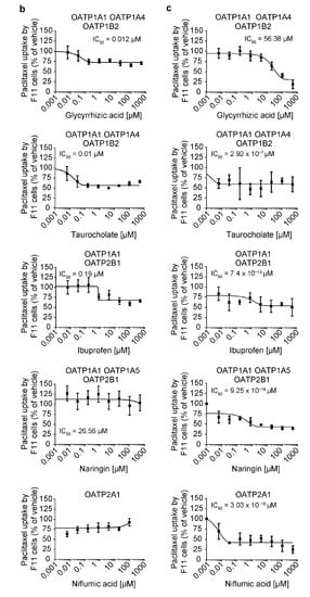 To determine whether paclitaxel is actively transported by one of these transporters, we incubated neurons with known pharmacological inhibitors at increasing concentrations. Neuronal cell line F11 was incubated with drug-transport inhibitors (Table 3) at 0.0064 µM, 0.032 µM, 0.16 µM, 0.8 µM, 4 µM, 20 µM, 100 µM, or 500 µM. After 1 h of incubation with drug-transport inhibitors, cells were exposed to either 1 µM fluorescent paclitaxel with fluorescence measured on the plate reader (Figure 2b) or 3 µM of solvent-based paclitaxel with concentrations measured by LC-MS/MS (Figure 2c). Glycyrrhizic acid, taurocholate, ibuprofen, and niflumic acid (OATP1A1, OATP1A4, OATP1B2, OATP2A1, and OATP2B1) inhibited fluorescent paclitaxel uptake by about 25% (Figure 2b). Solvent-based paclitaxel uptake was inhibited by about 50% with taurocholate, ibuprofen, and naringin (OATP1A1, OATP1A4, OATP1A1, OATP1B2, and OATP2B1). OATP2A1 inhibition via niflumic acid decreased solvent-based paclitaxel translocation into the neuron by approximately 60%. However, the most potent drug was glycyrrhizic acid, which reduced paclitaxel uptake by about 75% at a concentration of 100 µM (Figure 2c). Hence, paclitaxel is most likely actively transported by OATP1A1, OATP1B2, and OATP2A1.