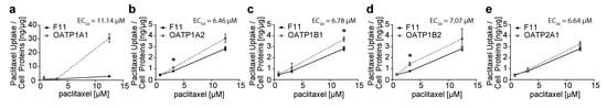 Overexpression of OATPs increases paclitaxel uptake in transfected F11 cells. Overview of F11 cell line and overexpressing cell lines exposed to 0.78 µM, 3.125 µM, and 12.5 µM of paclitaxel (x-axis) for 30 min. Graphs show paclitaxel amount in ng per µg cell. (a) OATP1A1 overexpressing cell line, (b) OATP1A2 overexpressing cell line, (c) OATP1B1 overexpressing cell line, (d) OATP1B2 overexpressing cell line, and (e) OATP2A1 overexpressing cell line paclitaxel uptake in comparison with F11 cell line paclitaxel uptake. n = 3 independent cell culture preparations. Graphs depict mean ± SD. Statistical comparison was performed between all groups (Kruskal–Wallis test, Dunn’s multiple comparison test); * p < 0.05.