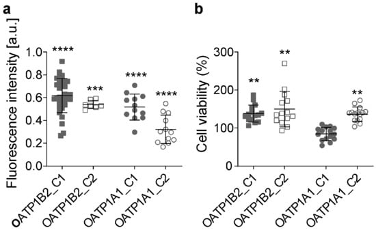 Influence of OATP1A1 and OATP1B2 knock-out on paclitaxel uptake into F11 cells. (a) OATP1A1-clone1 cell line (OATP1A1_C1), OATP1A1-clone2 cell line (OATP1A1_C2), OATP1B2-clone1 cell line (OATP1B2_C1), and OATP1B2-clone2 cell line (OATP1B2_C2) were treated with 1 µM of fluorescent paclitaxel for 30 min. Fluorescence intensity of cells was measured and compared with vehicle-treated cells (n = 8). (b) Knock-out cells were treated with 1 μM of paclitaxel for 72 h. Cell viability was assessed via MTT assay and compared with vehicle-treated cells (n = 15). Graphs depict mean ± SD; n = independent cell culture preparations. Statistical comparison was performed between all groups (Kruskal–Wallis test, Dunn’s multiple comparison test); ** p < 0.01, *** p < 0.001, **** p < 0.0001.