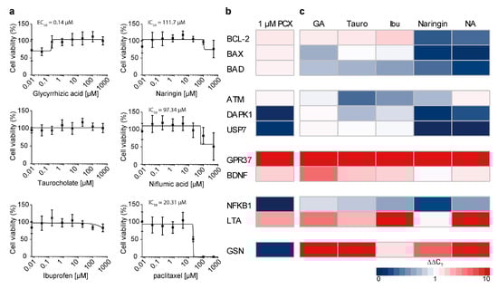 A wide array of toxicity markers was investigated via RT-qPCR to further study the prevention of paclitaxel-induced neurotoxicity. F11 cells were incubated with 1 µM of paclitaxel (Figure 6b) or with 10 µM of inhibitory drug and 1 µM of paclitaxel for 48 h (Figure 6c). Subsequently, RT-qPCR was performed to assess the expression level of anti-apoptotic marker BCL-2; proapoptotic marker BAX and BAD; apoptosis and cell cycle markers ATM, DAPK1, and USP7; neuroprotective markers GPR37 and BDNF; inflammatory markers NFKB1 and LTA; and actin filament marker GSN. We found that paclitaxel treatment on itself mainly increased the expression of GPR37 and NFKB1. Glycyrrhizic acid decreased BAX and BAD expression while increasing BCL-2 expression and further increased the expression of neuroprotective markers GPR37 and BDNF.