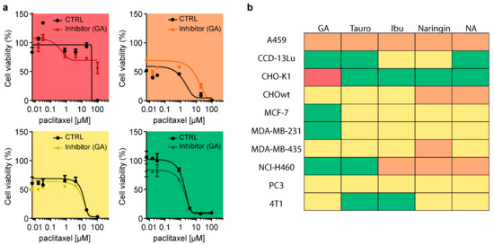 Viability changes of cancer cells after treatment with OATP inhibitors and paclitaxel. (a) Representative results of MTT cell viability assay. Red (represented with CHO-K1 cell line with glycyrrhizic acid (GA)) indicates complete loss, and orange (A459 cell line with GA) indicates significant loss of antineoplastic properties with inhibitor plus paclitaxel treatment compared with paclitaxel treatment alone. Yellow (MDA-MB-435 cell line with GA) indicates no changes between treatments. Green (MDA-MB-231 cell line with GA) indicates enhanced toxicity to cancer cells with inhibitor plus paclitaxel treatment compared with paclitaxel treatment alone. (b) Cancer cell lines A459, CCD-13Lu, CHO-K1, CHOwt MCF-7, MDA-MB-231, MDA-MB-435, NCI-H460, PC3, and 4T1 were treated with inhibitors, namely glycyrrhizic acid (GA), taurocholate (Tauro), ibuprofen (Ibu), naringin, and niflumic acid (NA), plus increasing concentrations of paclitaxel for 72 h. Cell viability was compared with paclitaxel-treated cells, and the results were indicated as described in (a) in the corresponding color (n = 3). Graphs depict mean ± SD; n = independent cell culture preparations.