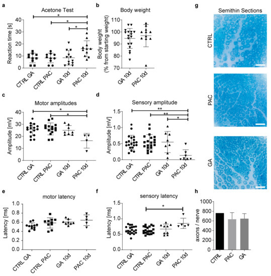 Nerve conduction studies of compound motor action potential (CMAP) and sensory nerve action potential (SNAP) were performed blinded on d0 and d11. Recordings of compound muscle action potential (CMAP) amplitudes, sensory nerve action potential (SNAP) amplitudes, and latencies were performed on a PowerLab single acquisition setup (ADInstruments, Grand Junction, CO, USA), as described before [26].