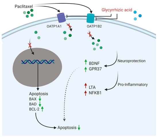 Overall, we here provide evidence that OATP family members are able to translocate paclitaxel. We could modulate this transport to prevent paclitaxel uptake into the neuron and prevent neurotoxic effects while still sustaining the antineoplastic characteristics of paclitaxel (Figure 9). We have found OATP1A1 and OATP1B2 to be the most suitable targets for an in vivo study and have demonstrated that the inhibition of those transporters with glycyrrhizic acid is able to reverse induced peripheral neuropathy.