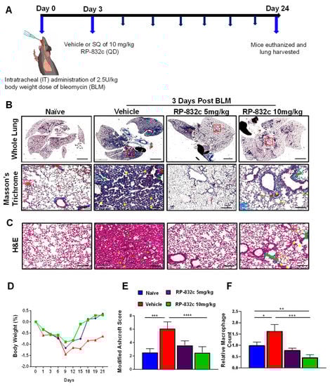 C57BL/6J mice were obtained from Envigo, Indianapolis, IN, USA. All animal studies were approved by the IACUC (Murigenics, Inc., Vallejo, CA, USA). After 3 days of acclimation, the mice were challenged with a single 2.5 U/kg body weight dose of bleomycin (BLM) intratracheally (IT), and a vehicle (normal saline) or RP-832c(QD) was administered subcutaneously for 21 days starting 3- and 14-days post-BLM-challenge. Body weights were measured daily, and lung weight was measured at the end of each study.