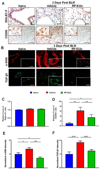 CD206 expression was significantly decreased in BLM-challenged RP-832c-treated mice compared with BLM-challenged vehicle-treated mice (p-value < 0.001) (Figure 3A,D). Furthermore, we observed no significant difference in Siglec-F/CD170 (a marker for resident alveolar macrophages) expression levels between the different groups (Figure 3A,C). Because the role of TGF-β1 is well established in promoting fibrosis by inducing a fibroblast to myofibroblast switch, we further measured the fibrosis markers TGF-β1 and alpha-smooth muscle actin (α-SMA). BLM-challenged RP-832c-treated lung tissue showed a significant reduction (p-value < 0.001) in both α-SMA (Figure 3B,E) and TGF-β1 (Figure 3B,F) expression compared with BLM-challenged vehicle-treated mice.