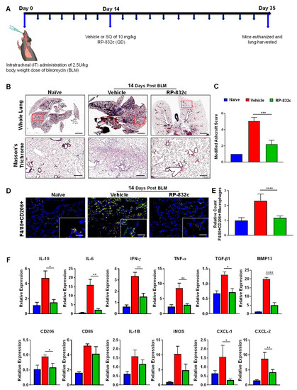 RP-832c treatment blocks the “cytokine storm” in an established late model of BLM-induced lung fibrosis. (A) A schematic of the animal study in which mice were challenged with 2.5 U/kg body weight dose of BLM on day 0. A total of 14 days post-BLM challenge, mice were treated with either a vehicle or 10 mg/kg RP-832c (QD) for an additional 21 days. (B) The upper panel shows 2× representative images of Masson’s Trichrome staining of whole lung tissue, and the lower panel contains representative 20× images of Masson’s Trichrome-stained lung tissue. (C) A bar graph for the modified Ashcroft scoring of the lung tissues. (D) Representative 20× and 40× images of immunofluorescence staining of lung tissue sections with anti-F4/80 (red) and Anti-CD206 (green). (E) Quantification of F4/80 & CD206 double-positive macrophages in the IF staining of the lung tissues. Quantification was performed by measuring counts in 10 separate fields using Metamorph imaging software. (F) RT-PCR of IL-8 functional homologs (CXCL-1, CXCL-2), inflammatory cytokine markers (CD206, CD86, IL-6, IL-10, IFN-γ, TNF-α, IL-1B, iNOS), and fibrosis markers (TGF-β, and MMP-13) using RNA extracted from FFPE tissue sections. S. E. **** p < 0.0001, *** p < 0.001, ** p < 0.01 and * p < 0.05 were considered significant.