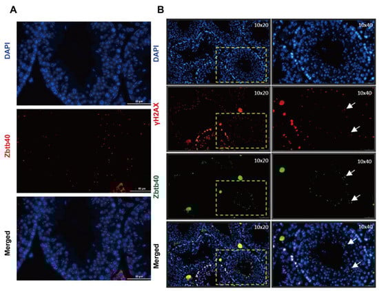 It has been reported that ZBTB40 is essential for spermatogenesis in Epinephelus coioides [15]. To explore the function of ZBTB40 in regulating mammalian spermatogenesis, we detected the expression of ZBTB40 in mouse testes using immunohistochemistry. We found that ZBTB40 was specifically present in mouse spermatocytes (Figure 1A). Interestingly, most of the ZBTB40 foci were co-localized with γH2AX (Figure 1B), a hallmark of chromatin remodeling and inactivation of sex chromosome events during spermatogenesis. These results raised the possibility that ZBTB40 may be involved in mediating mammalian spermatogenesis.