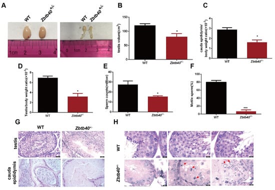 The phenotypical characteristics of Zbtb40+/− male mice. (A) Testes (left panel) and cauda epididymis (right panel) of the Zbtb40+/−#4 mice and the WT mice. (B–D) Comparison of testicular volume (B), cauda epididymis and body weight ratio (C), and testis/body weight ratio (D) of the 5-month-old Zbtb40+/− male mice and the WT mice. (E) Sperm counts were reduced in the Zbtb40+/− mice compared to the WT mice. (F) Motile sperm was decreased in the Zbtb40+/− mice compared to the WT mice. For p values in (B–F) * indicated p < 0.05, *** implicated p < 0.001, n = 3. (G) H&E staining demonstrated abnormal morphology of testes and cauda epididymis of the Zbtb40+/− mice. (H) Representative pictures of testes in the Zbtb40+/− mice and WT mice. Red arrows indicated pyknotic spermatocytes.