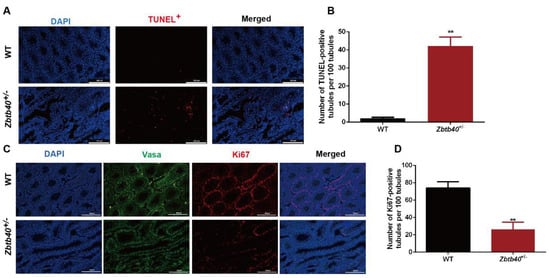 We next probed the function of Zbtb40 in controlling apoptosis and the proliferation of male germ cells. The TUNEL assay showed an increase in apoptotic male germ cells in Zbtb40+/− testes compared with those of WT mice (2.600 ± 0.9747 vs. 39.93 ± 4.299, p = 0.0001, Figure 3A,B). Furthermore, the percentage of Ki67-positive germ cells was significantly reduced in the Zbtb40+/− testes (74.03 ± 4.240 vs. 26.37 ± 4.707, p = 0.0017, Figure 3C,D). These results indicate that Zbtb40 deficiency leads to the enhancement of apoptosis and the inhibition of the proliferation of male germ cells.