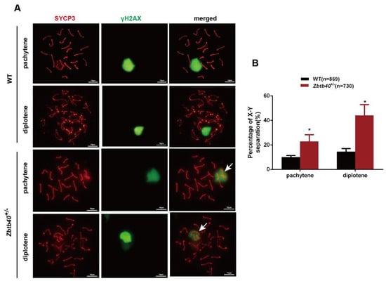 We detected that meiosis of the spreads of spermatocytes via immunofluorescence staining for synaptonemal complex protein 3 (SYCP3), the lateral element component, and γH2AX, a marker of double-strand breaks (DSBs). Significantly, the percentages of pachytene spermatocytes (10.50 ± 0.8145, n = 869 vs. 21.20 ± 2.821, n = 730, p = 0.0219) and diplotene spermatocytes (15.10 ± 1.550, n = 869 vs. 41.50 ± 5.838, n = 730, p = 0.0120) with univalent XY in the Zbtb40+/− mice were enhanced when compared to the WT mice (Figure 4A,B). Unlike autosomes, there is a very short but highly homologous DNA sequence, namely the pseudoautosomal region (PAR), at the ends of the long arms and the distal ends of the short arms of the human X and Y chromosomes, where meiotic pairing and chromosome interchange occur [16]. This result suggests that the Zbtb40 knockout renders XY chromosomes more susceptible to precocious separation and affects the recombination and pairing of the sex chromosomes in meiotic prophase. No significant difference was seen in the percentages of leptotene, zygotene, pachytene, or diplotene spermatocytes between Zbtb40+/− mice and the WT mice (Figure S3).