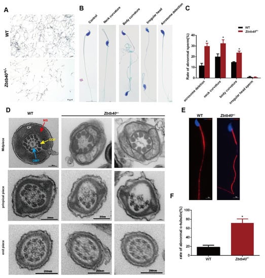The sperm of Zbtb40+/− male mice show flagellum deformities. (A) Pap stain was used to observe sperm morphology of the Zbtb40+/− mice and the WT mice. (B) Representative photos of abnormal sperm of the Zbtb40+/− mice. (C) The bar chart indicates the rates of abnormal sperm in samples of the Zbtb40+/− mice. (D) TEM of the cross-sections of sperm flagella displayed abnormal axoneme and peri-axoneme structures of the Zbtb40+/− mice. ODFs: outer dense fibers; DMT: outer doublet microtubules; MS: mitochondrial sheath; CP: central pair complex. (E) Immunofluorescence was used to observe expression of α-tubulin in sperm tails of the Zbtb40+/− mice. (F) The bar chart shows the rates of abnormal α-tubulin in the Zbtb40+/− mice. For p values of (C,F): * indicated p < 0.05, n = 3.