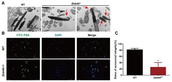 The sperm of Zbtb40+/− male mice assume abnormal acrosome biogenesis. (A) TEM was used to detect the acrosome biogenesis in the Zbtb40+/− mouse. Red arrows indicate abnormal acrosome. (B) Immunofluorescence was used to detect the expression of FITC-PSA in sperm head of the Zbtb40+/− mice. The white arrows denote flawed acrosome. (C) The bar chart displays the rates of acrosomal integrity in the Zbtb40+/− mice. For p values of t-tests in (C): * indicated p < 0.05, n = 3.