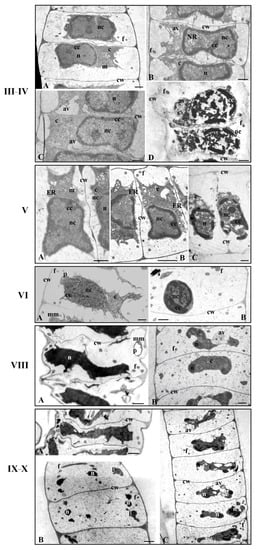 The ultrastructural changes were visible both in the nucleus and cytoplasm areas; however, they were not observed in the entire cell area in all spermatids at a specific stage of spermiogenesis. Sometimes, the propyzamide produced strong changes in the ultrastructure of the spermatids so it was difficult to precisely determine the stage of spermiogenesis. In some antheridial filaments (stages IV and V), the disturbances were so strong that they also occurred in the cell wall, which was somewhat stratified and less visible (Figure 2(III–IVD,VC)).