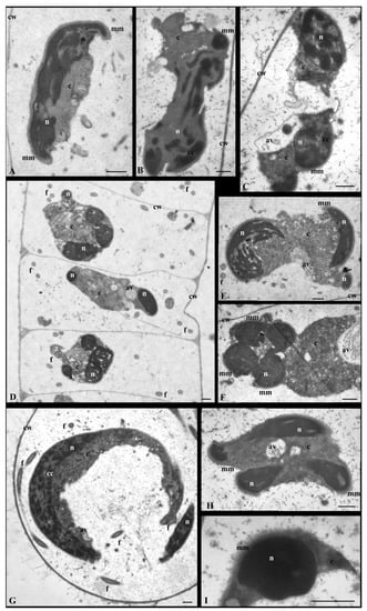 In the late-stage spermatids (IX, X) and, similarly, at stages VI–VIII, the process of chromatin condensation following propyzamide was incorrect. In the control sample, the nuclei became elongated and adopted a spiral shape (two coils at stage X), and numerous transverse sections of the nucleus at certain distances, near both sides of the cell walls of the antheridial filaments (Figure 2(IX–XB)), became visible. However, in some spermatids, following treatment with propyzamide, an arrangement of multiple nucleus transverse sections, often lying next to each other, was present (Figure 2(IX–XC) and Figure 4D,F). In some sections, the chromatin presented a homogeneous or fibrillar structure with bright electron spaces in between (Figure 4D–F,H), and often formed a patchwork pattern (Figure 4C,G). Despite the abovementioned disorders, there was also a presence of nuclei with correctly condensed chromatin (Figure 4I).